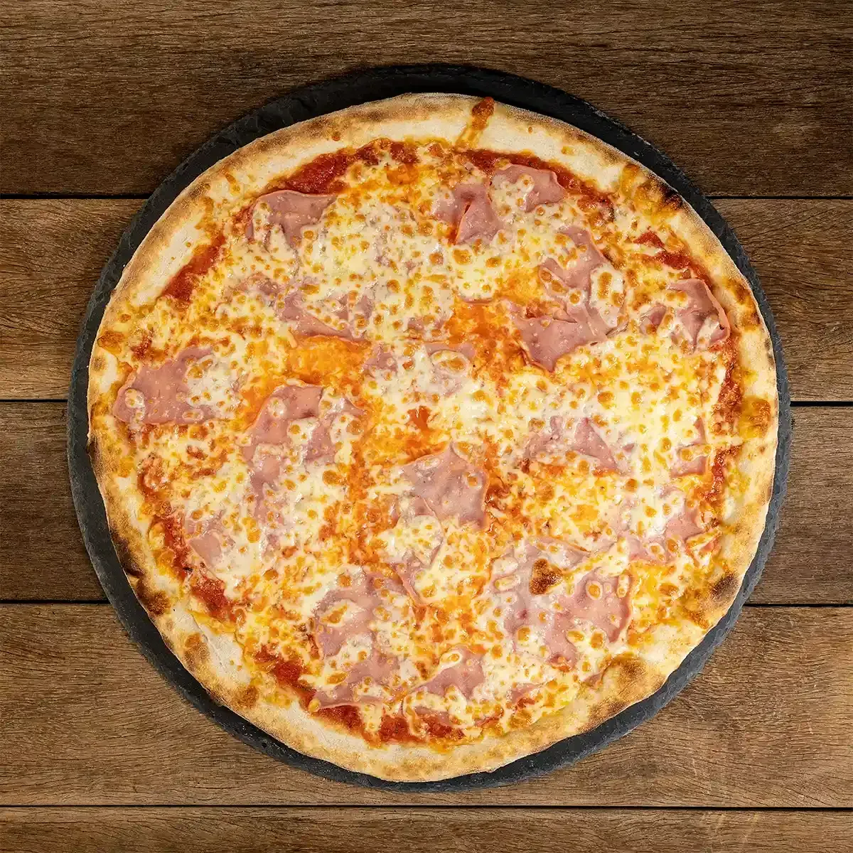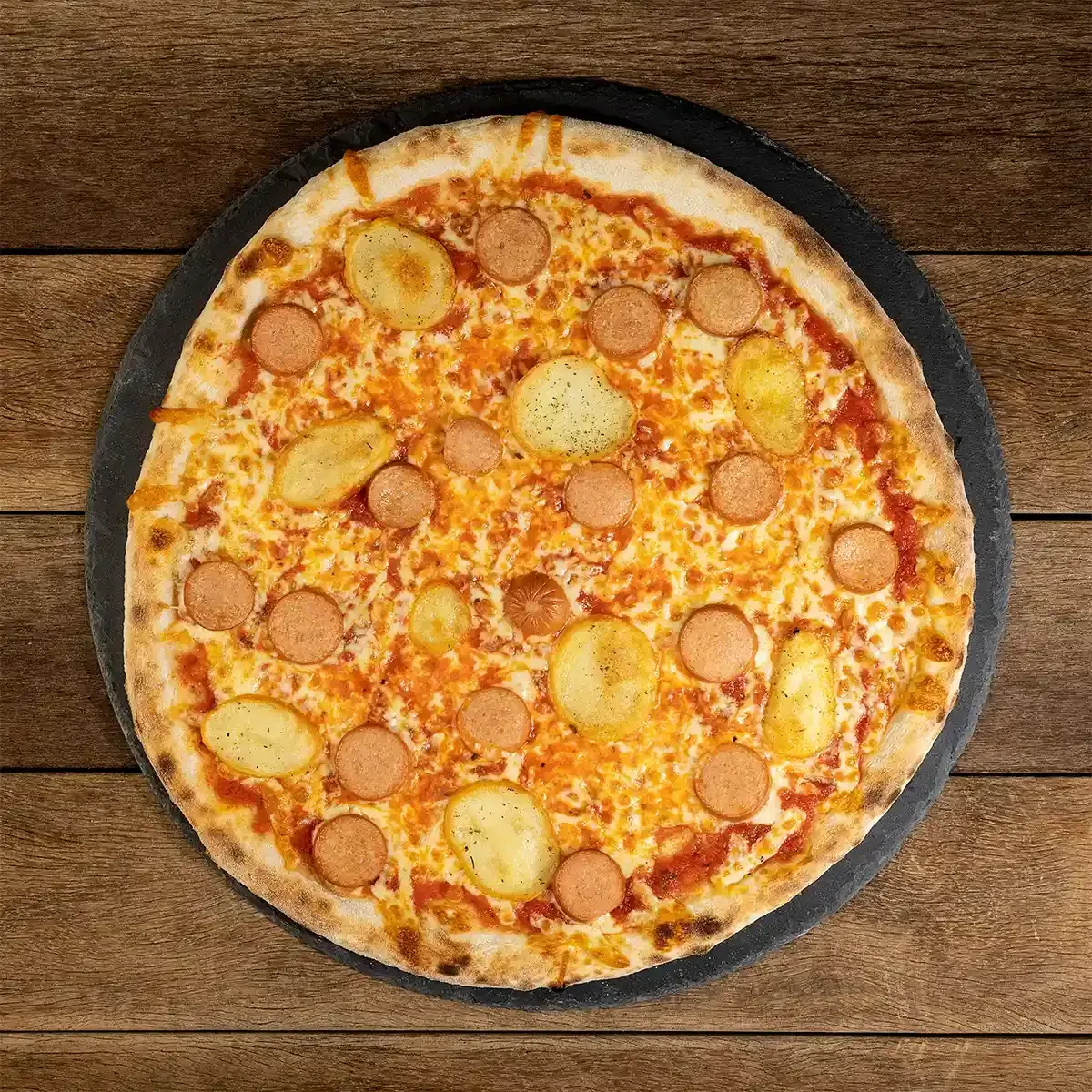Tomate / mozzarella / sofrito casero de carne con cebolla y bacón / líneas de salsa barbacoa / patatas